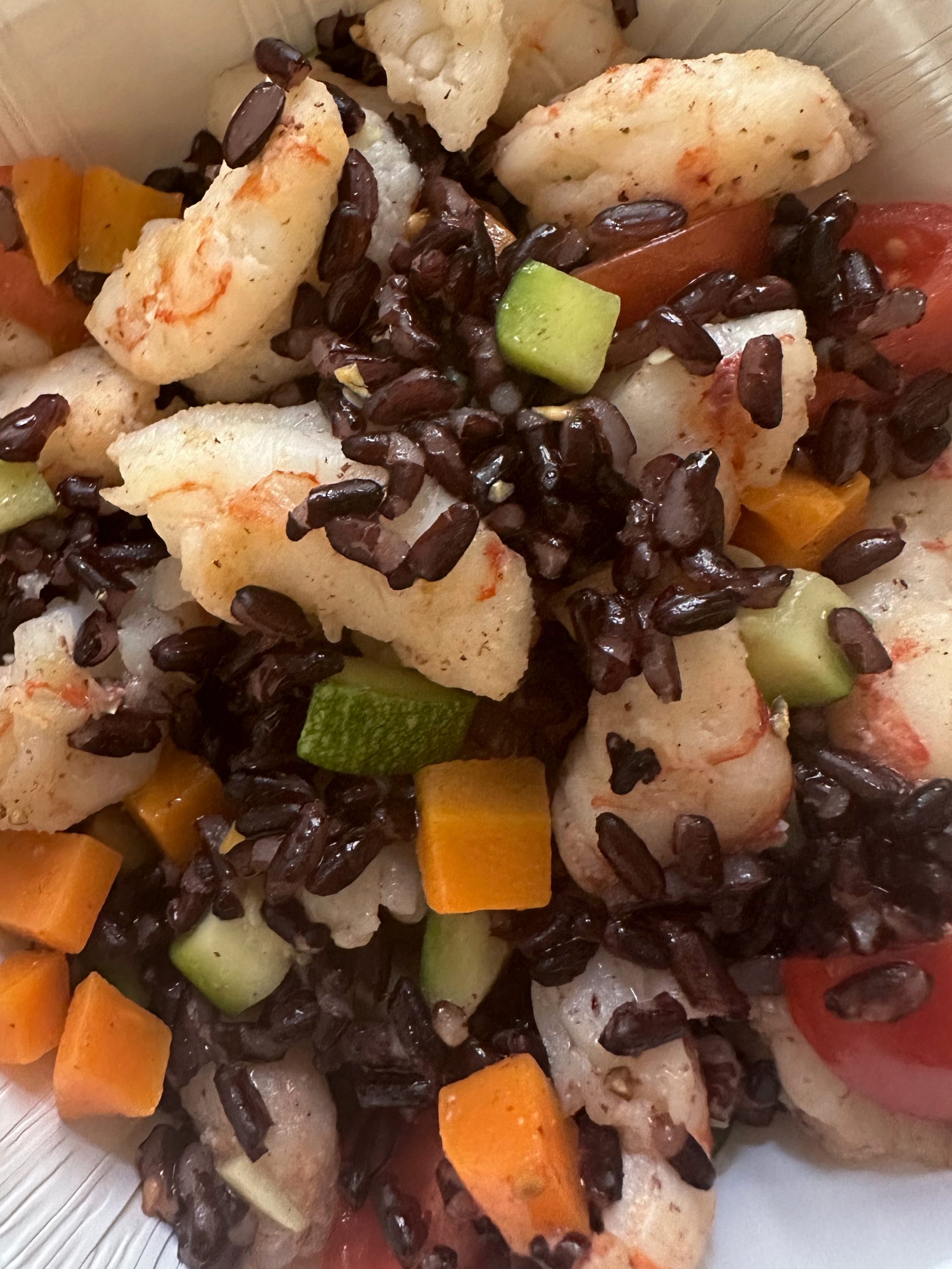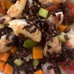 INGREDIENTI: GAMBERI, riso nero integrale, zucchine, pomodorini, carote,olio evo, sale, pepe.