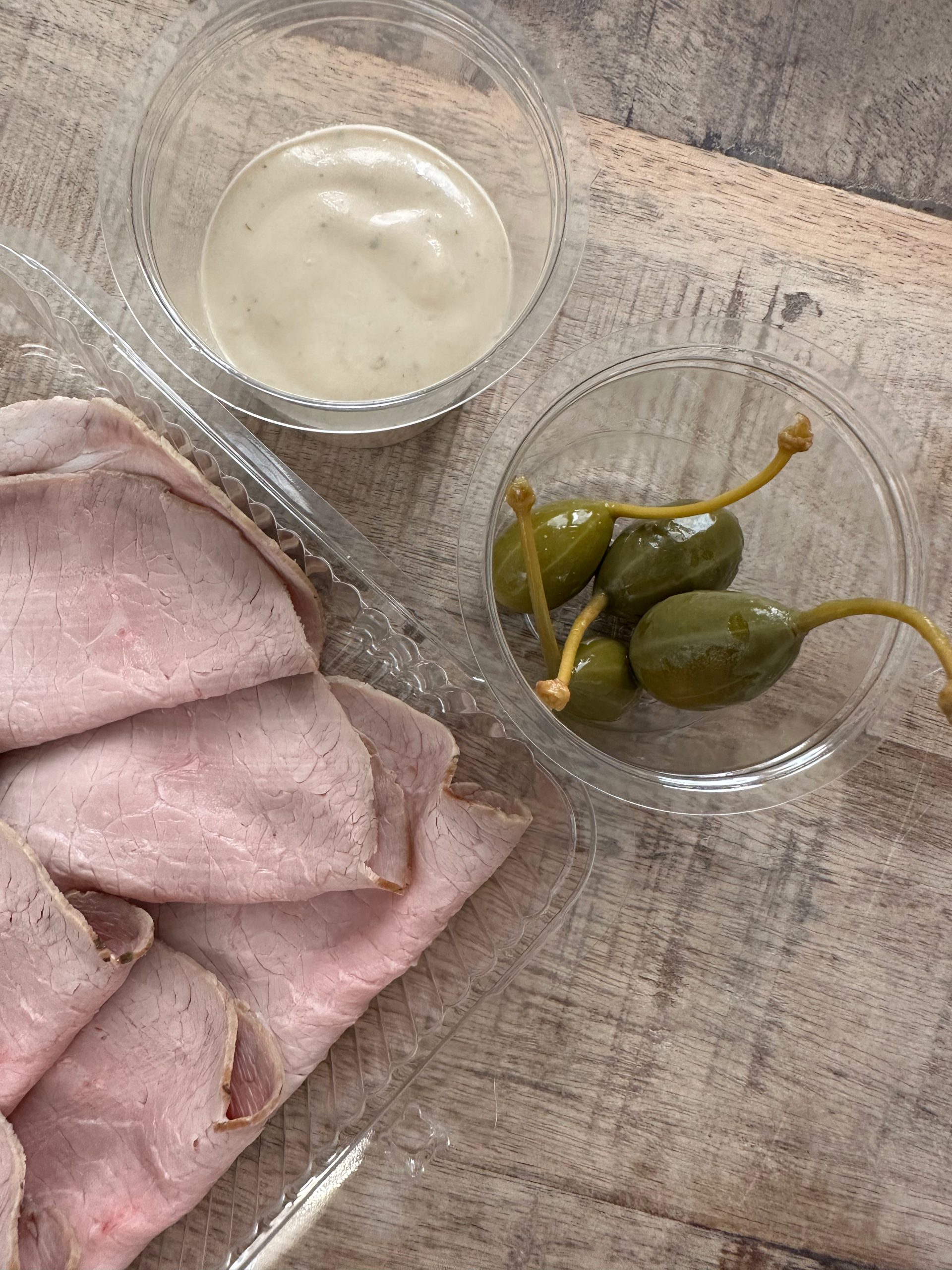 Servito freddo accompagnato dalla salsa tonnata INGREDIENTI: carne di bovino, salsa:tonno(tonno olio di oliva e sale,) maionese (UOVO, olio di semi, sale, aceto, senape) acciughe (olio di semi di girasole, sale), vino bianco, capperi sotto sale, pepe.   VASCHETTA DA…
