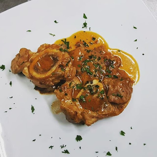 Ossibuchi di vitello, (contiene SEDANO, SOLFITI) con Purè(contiene LATTOSIO)patate,sale,pepe,NOCE MOSCATA