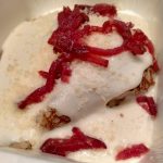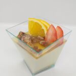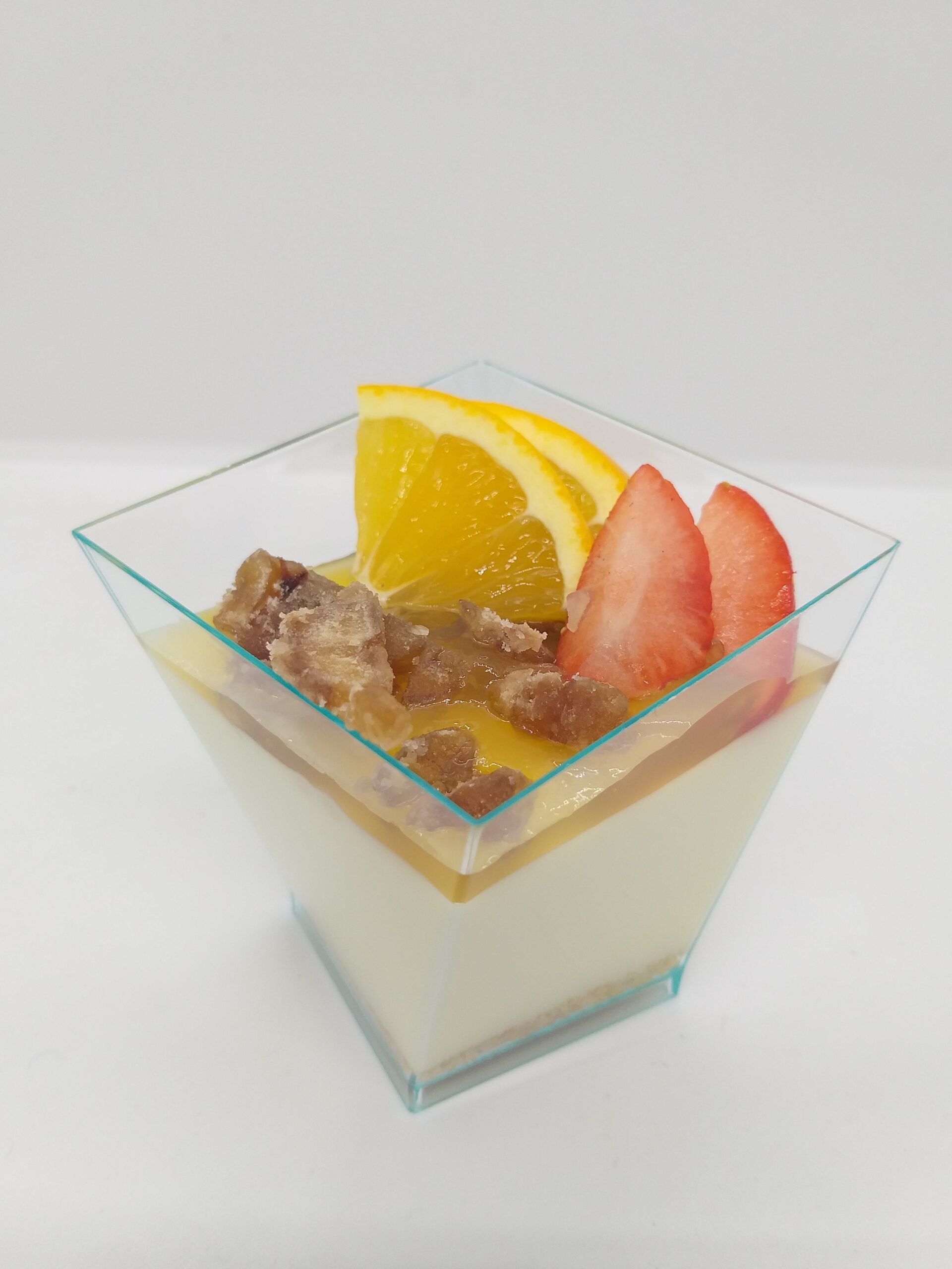 INGREDIENTI: ricotta, mascarpone, panna,(contiene LATTOSIO), aromi, gelatificante,zucchero, arancio, fragola, marron glacè. Crumble: biscotti (contiene GLUTINE) burro(contiene LATTOSIO)