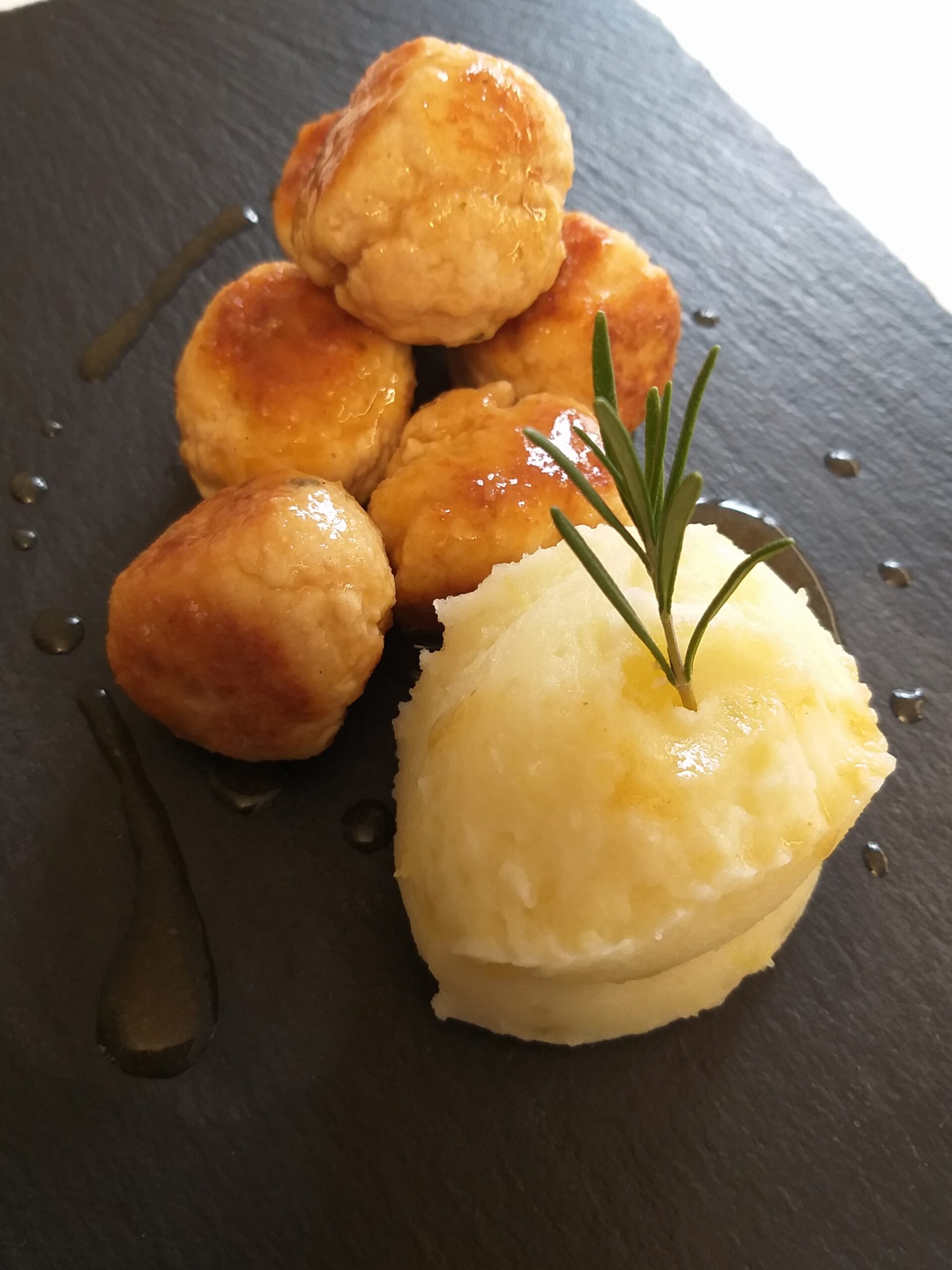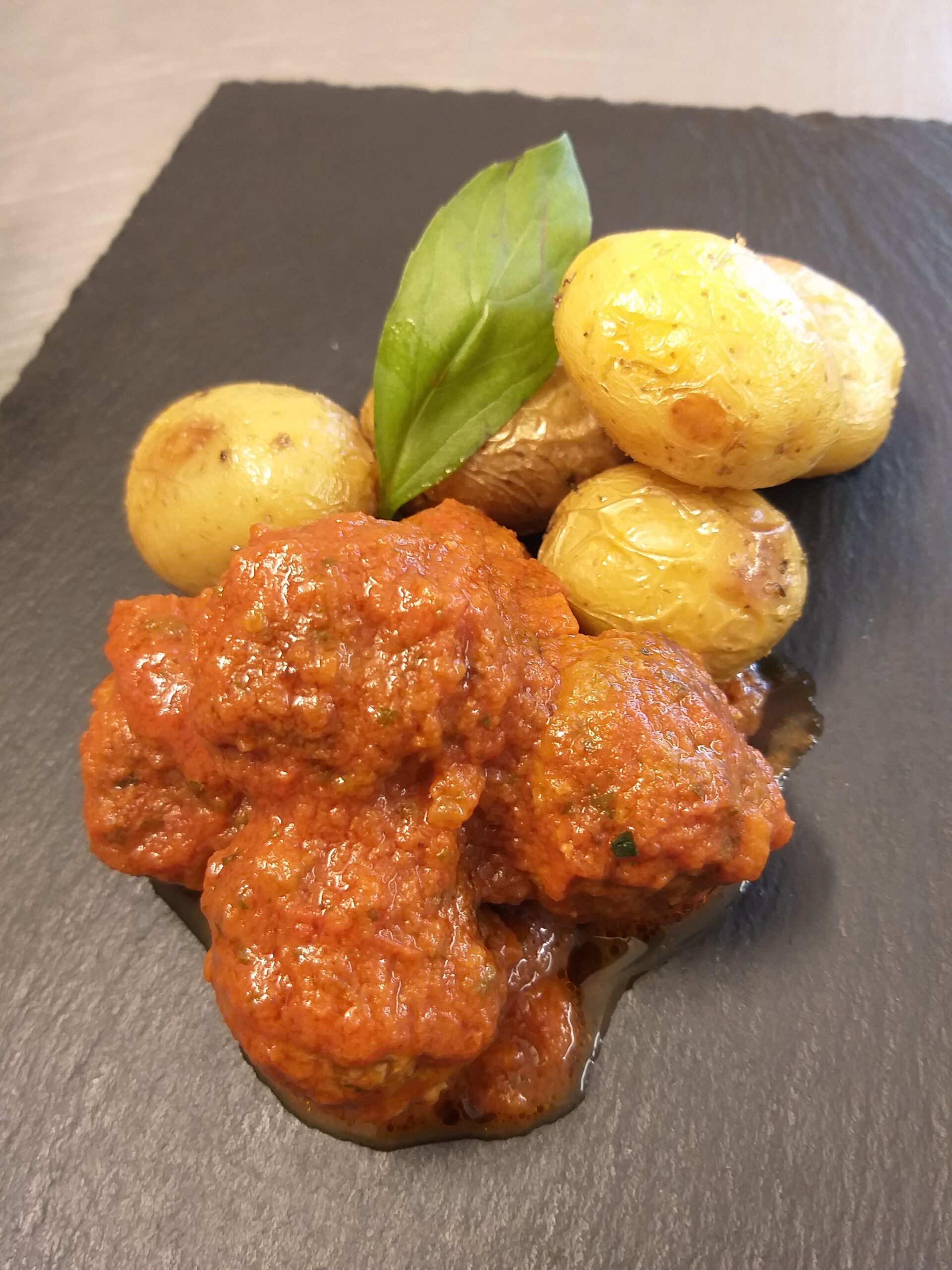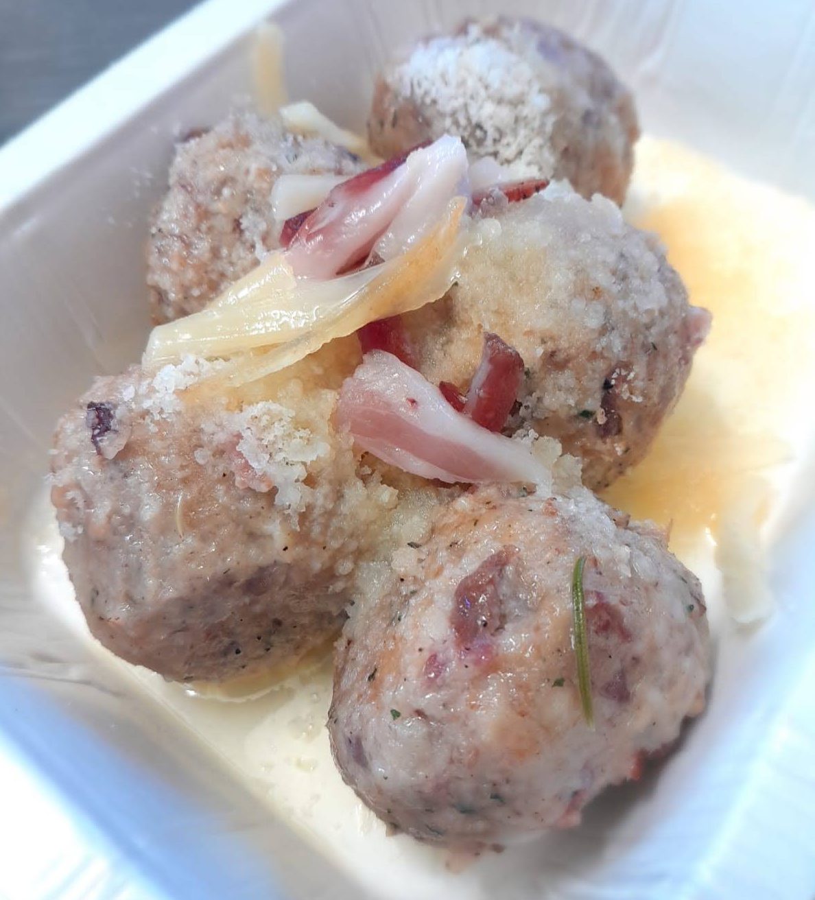 Polpette di Vitello con Funghi Porcini accompagnate dalla nostra polenta taragna contiene GLUTINE, LATTOSIO, UOVA, SEDANO;AGLIO,SOLFITI