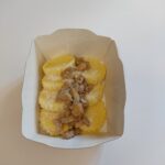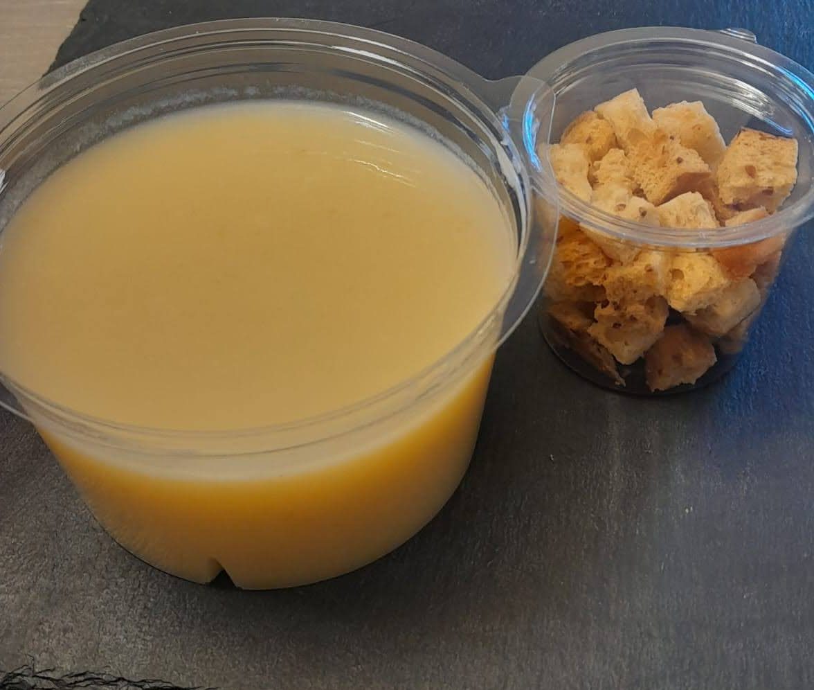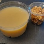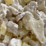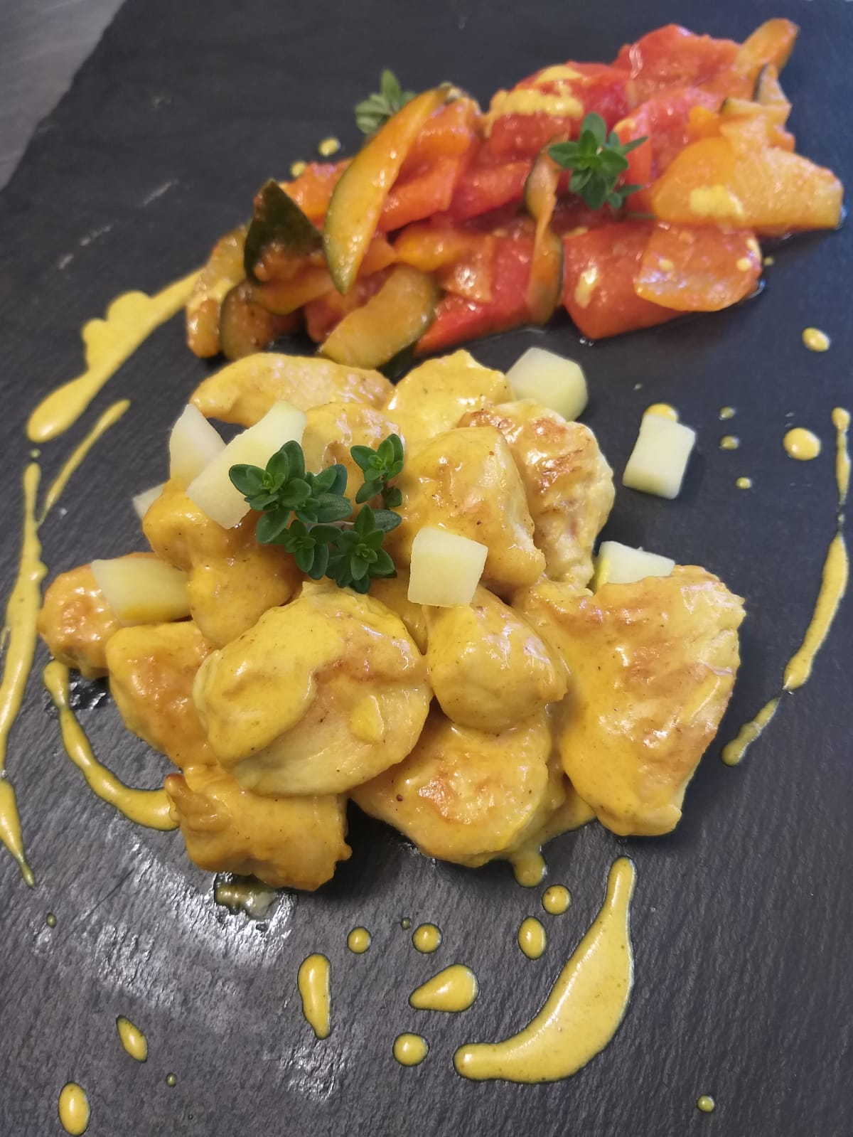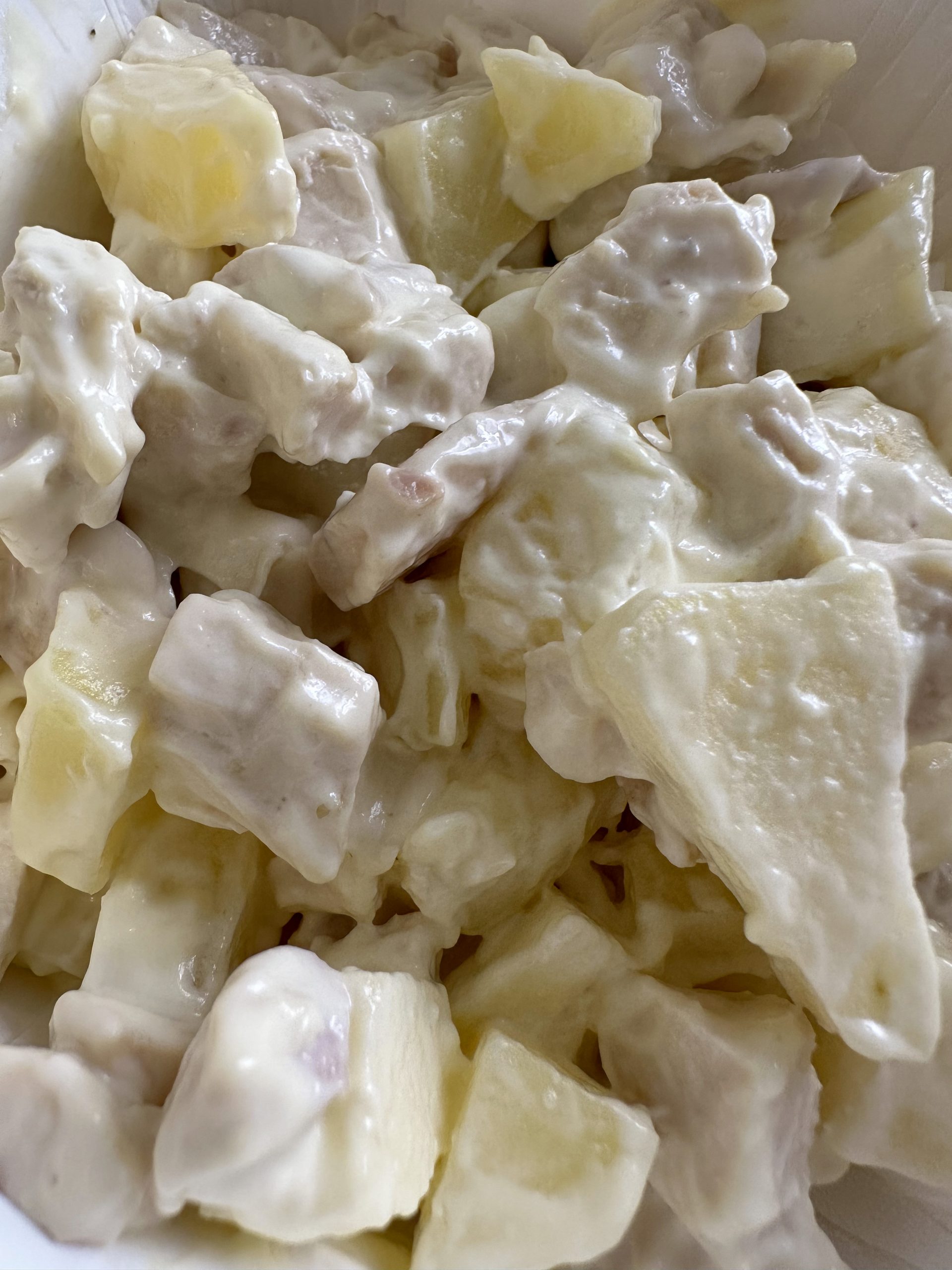 INGREDIENTI:pollo,patate,mele,maionese(UOVO,olio di semi,sale aceto) GUARNIZIONE: croccante di pane (contiene GLUTINE)