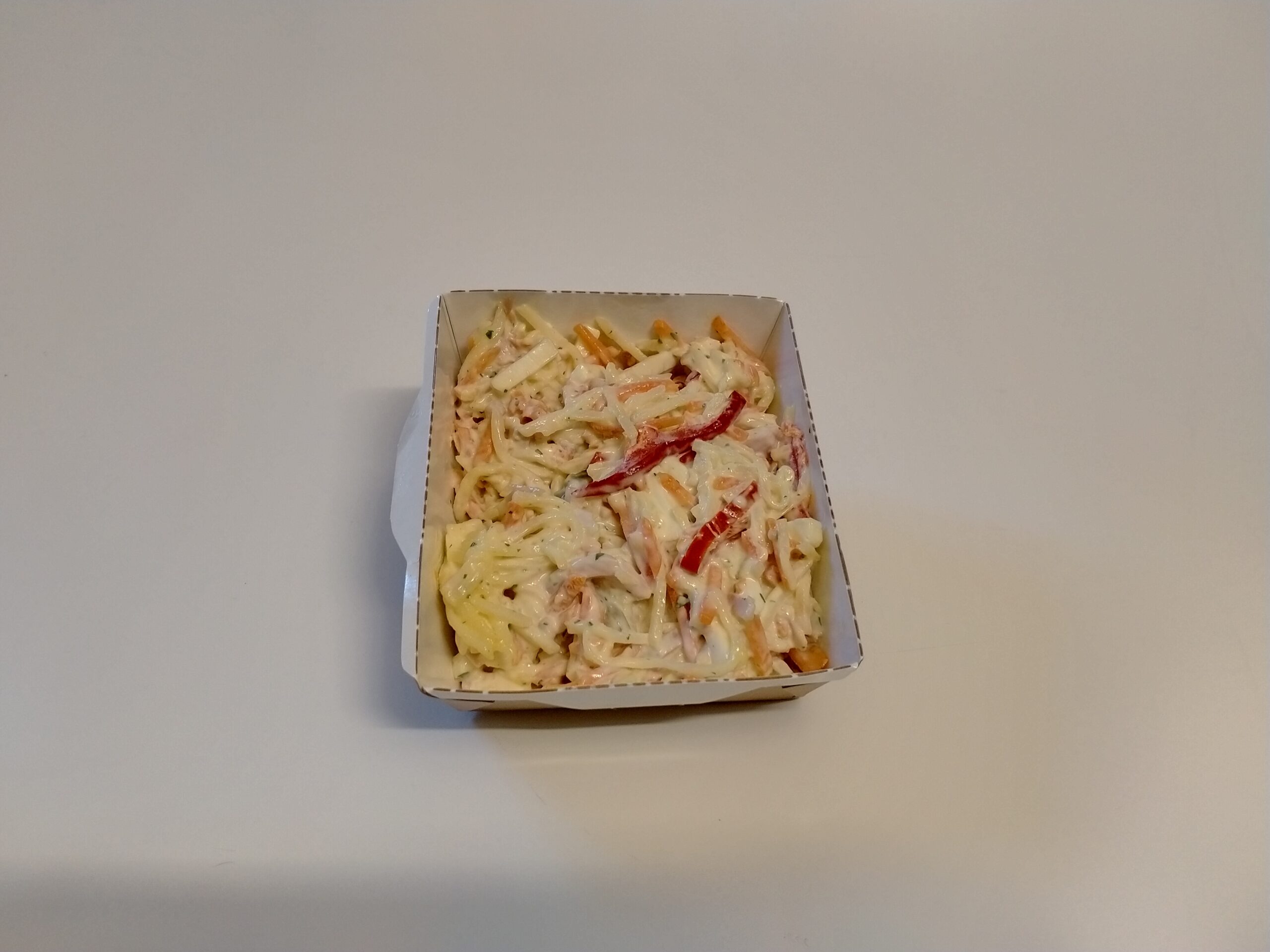 INGREDIENTI: peperoni, carote, prosciutto cotto( coscia di suino,sale, zucchero, destrosio, aromi) formaggio(contiene LATTOSIO), cetriolo, SEDANO rapa, sale, pepe. Salsa maionese;UOVO, olio,sale,aceto, limone