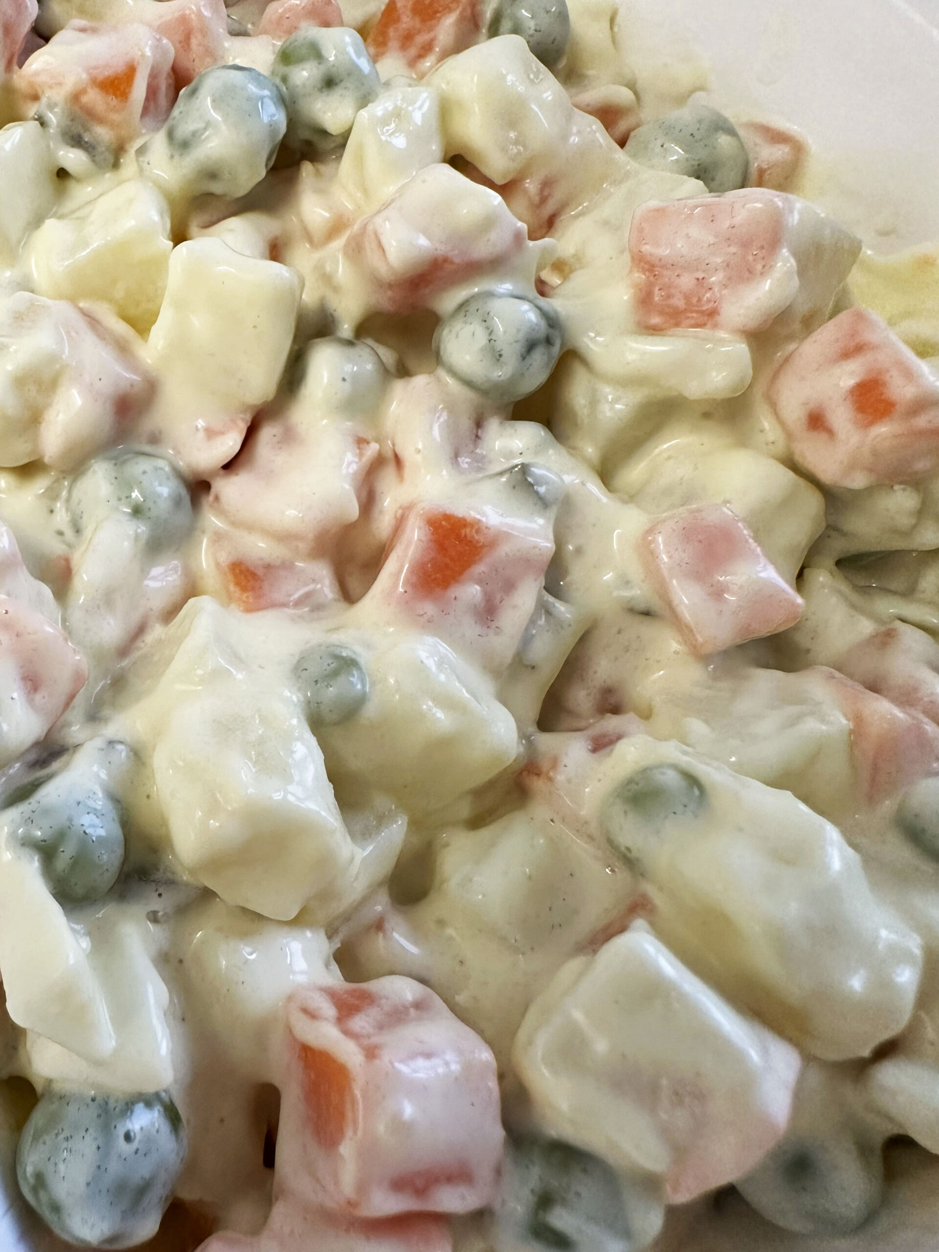 INGREDIENTI: patate, piselli, carote, pepe, Salsa( UOVO, olio di semi, limone , aceto, sale)