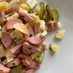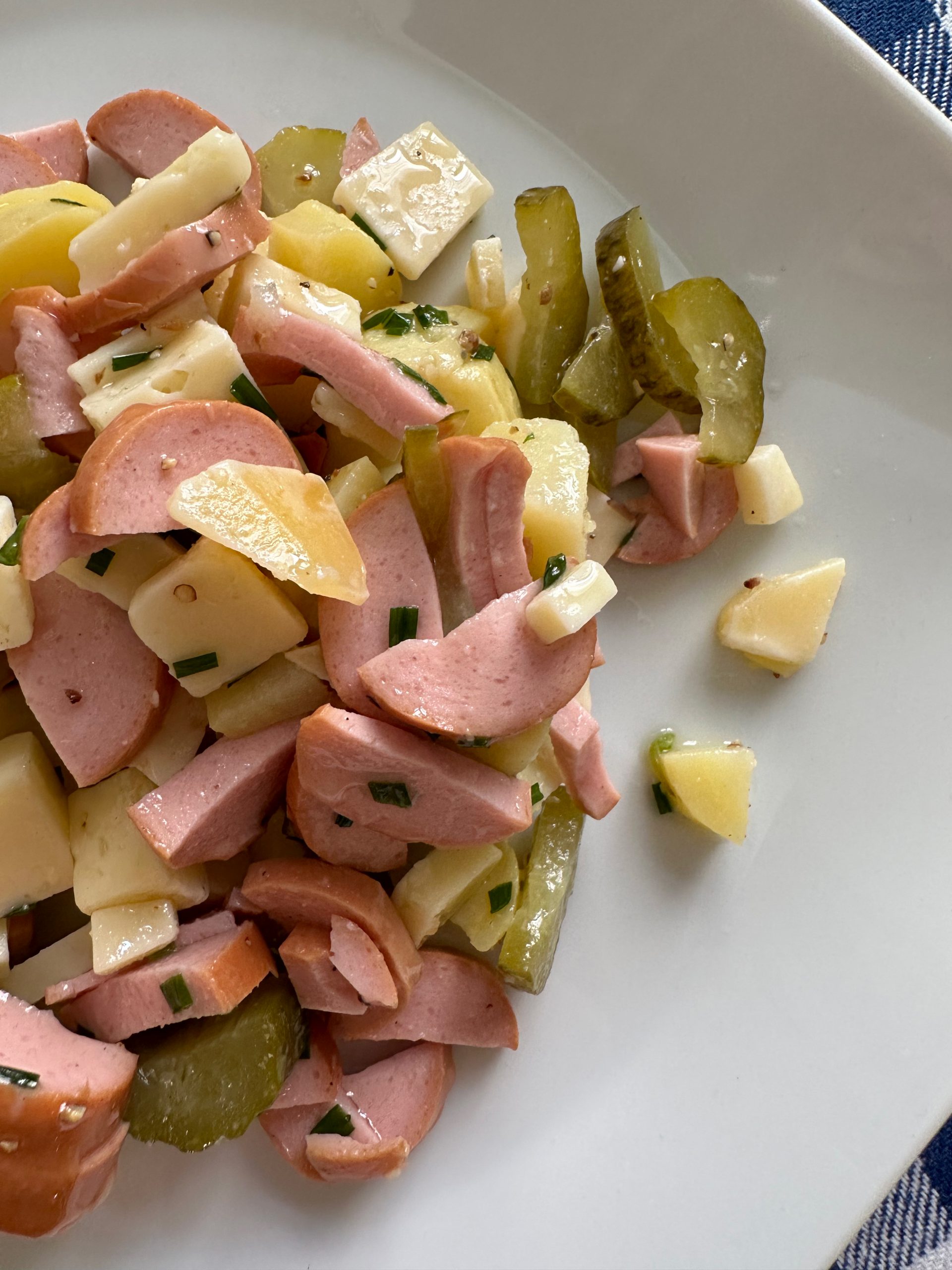 INGREDIENTI:WUSTEL(suino 5%, acqua , sale stab.dietrifosfati spezie, corr. di acidità: aceto di sodio, esaltatore di sapidità glutamm. monoss, patate, cetrioli, formaggio (contiene LATTOSIO) sale, pepe.