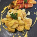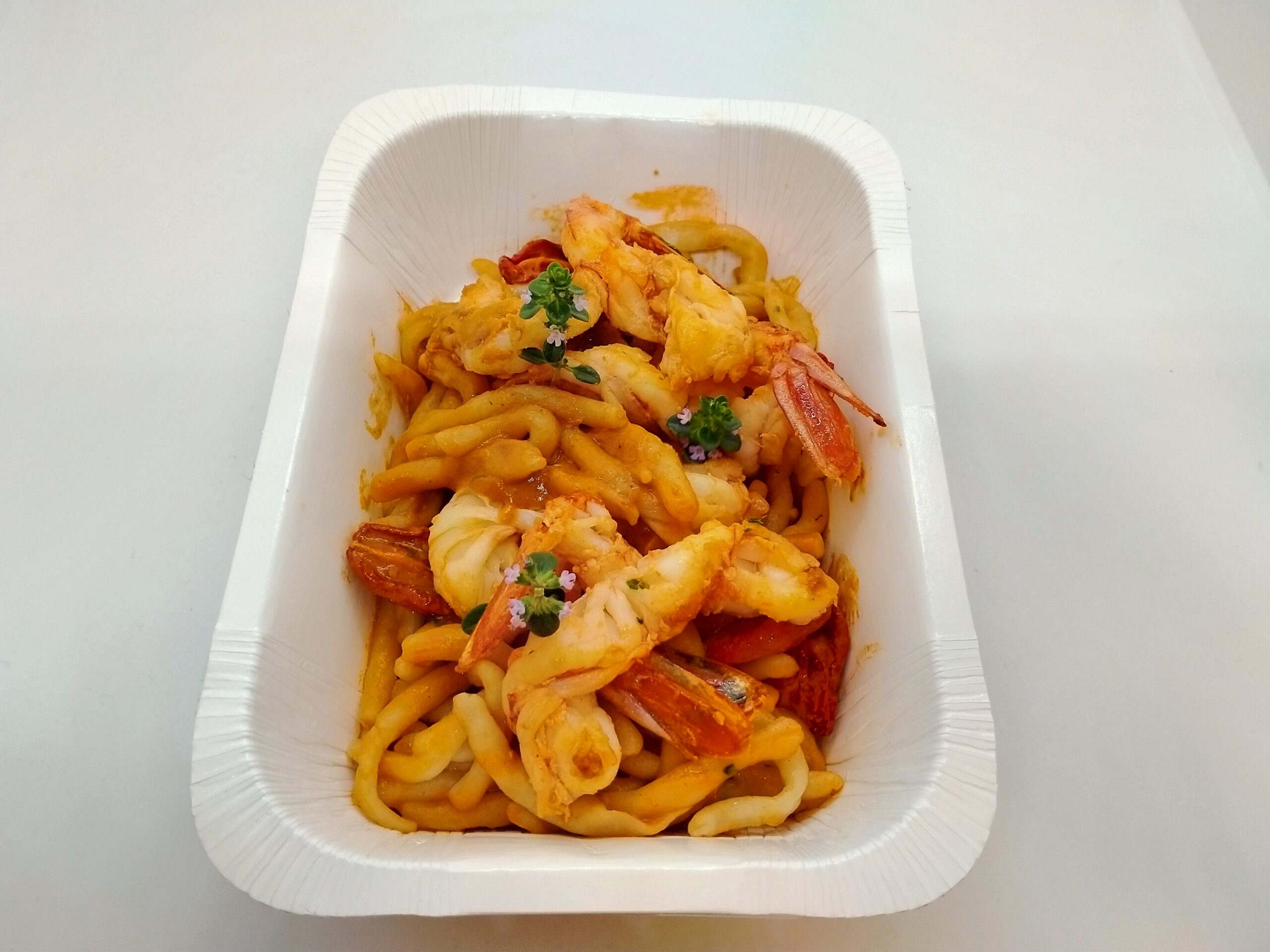 INGREDIENTI: cavatelli: farina(contiene GLUTINE) zafferano, sale, olio evo salsa allo scoglio: GAMBERI, CALAMARI,COZZE; VONGOLE; POLPO; pomodoro, prezzemolo. AGLIO; vino bianco(contiene SOLFITI)