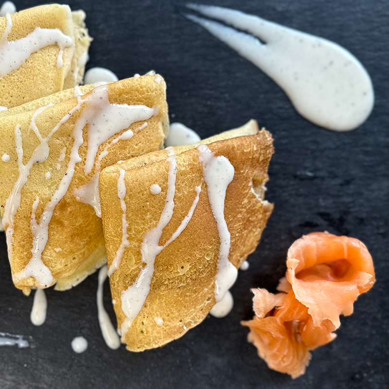 INGREDIENTI: crespella 20%all'UOVO, con ripieno80%, latte(contiene LATTOSIO), farina bianca(contiene GLUTINE),. per il ripieno: besciamella con latte(contiene LATTOSIO), farina 00(contiene GLUTINE), olio evo, , sale, NOCE MOSCATA,salmone affumicato, grana(contiene LISOZIMA dell'UOVO)