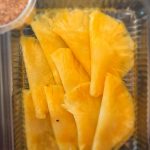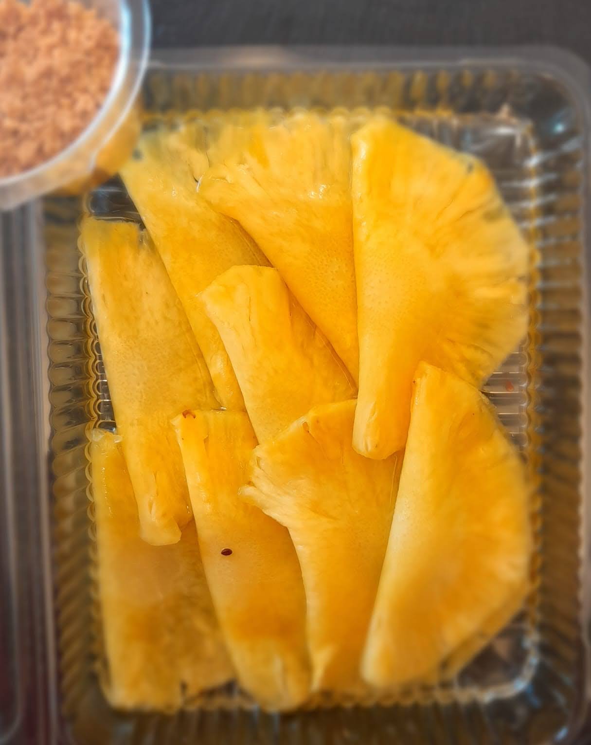 Ananas,zucchero di canna ,moscato dolce, succo di limone, succo d'arancio, anice stellato, cannella. GUARNIZIONE: granella di amaretto, arancio.