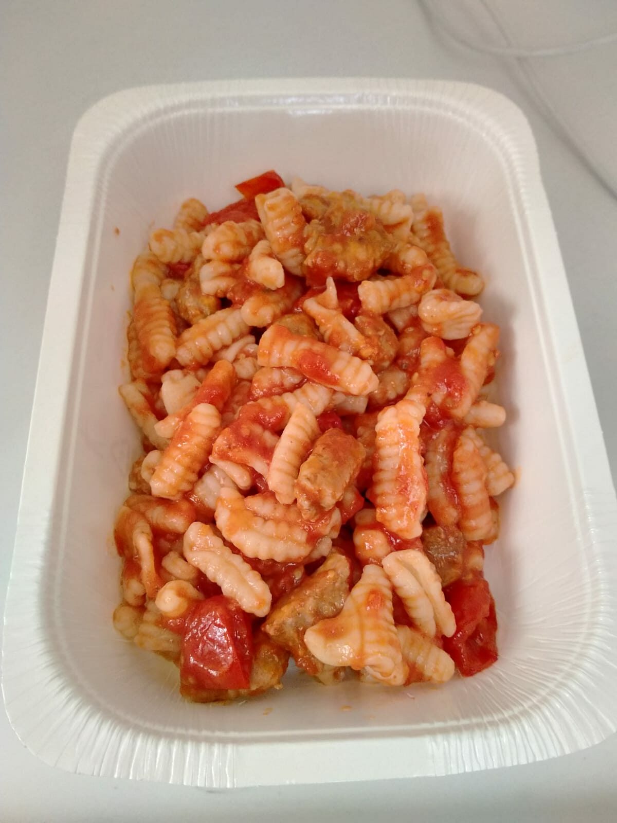 INGREDIENTI: farina00 (contiene GLUTINE),acqua,salsiccia (Carne di suino,sale.E262 Aceto di sodio;E300 Acido ascorbico;E 331 citrato di sodio aromi<b>aglio) datterini, concentrato pomodoro, olio evo, timo, sale.
