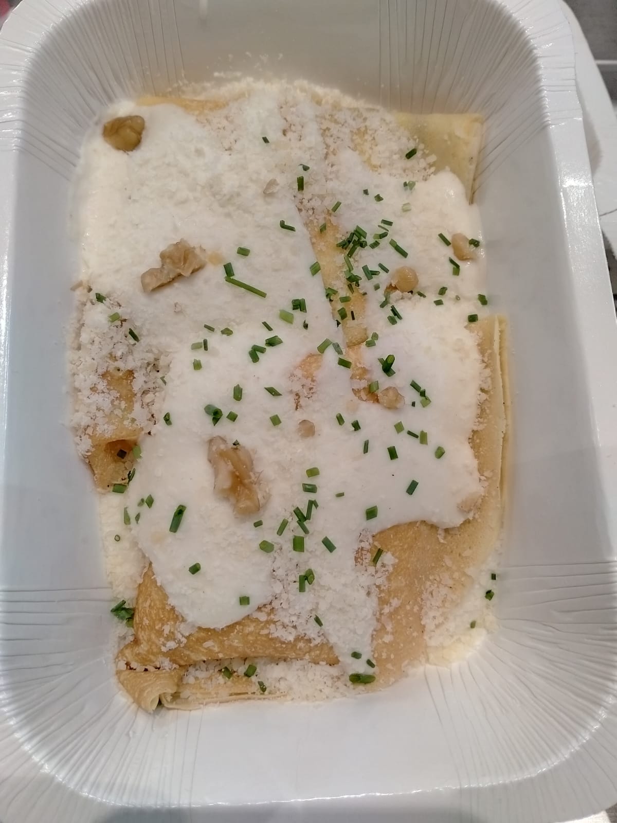 INGREDIENTI:Crespella20% all'UOVO con ripieno 80% UOVA, latte(contiene LATTOSIO), farina bianca 00(GLUTINE). per il ripieno besciamella con latte(contiene LATTOSIO)olio evo,farina (GLUTINE) sale, NOCE MOSCATA , gorgonzola (contiene LATTOSIO) speck( carne di suino, sale, spezie, destrosio, piante aromatiche , conservante :nitrato di…