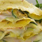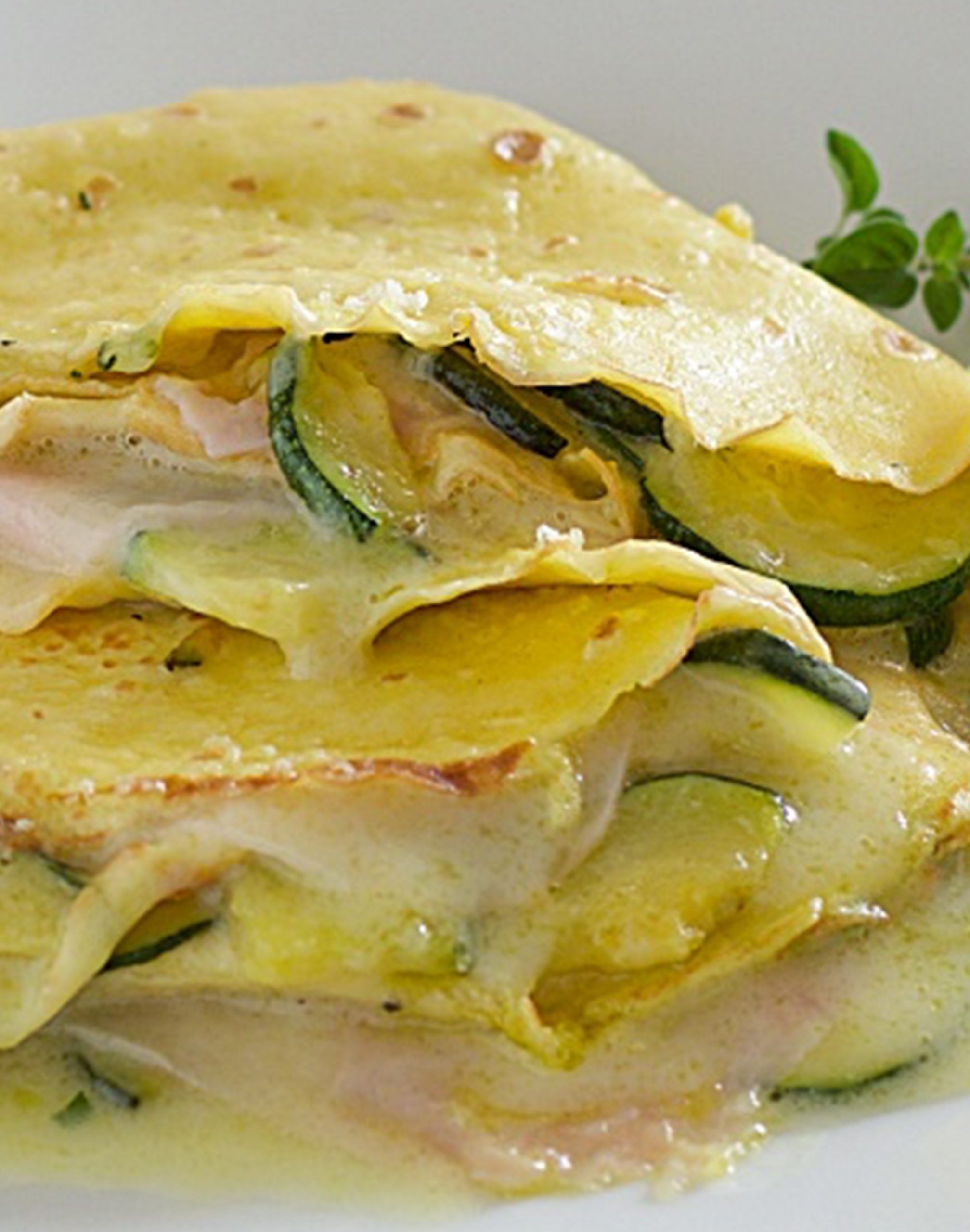 INGREDIENTI:Crespella 20% all’UOVO con ripieno 80% UOVA, latte (contiene LATTOSIO ), farina bianca 00 (GLUTINE) FARCIA:  zucchine, cipolla, olio, timo, basilico,sale, pepe. BESCIAMELLA : latte (contiene LATTOSIO) farina 00 bianca (GLUTINE) olio evo,sale, noce moscata grana(contiene LATTOSIO e LISOZIMA dell'UOVO)