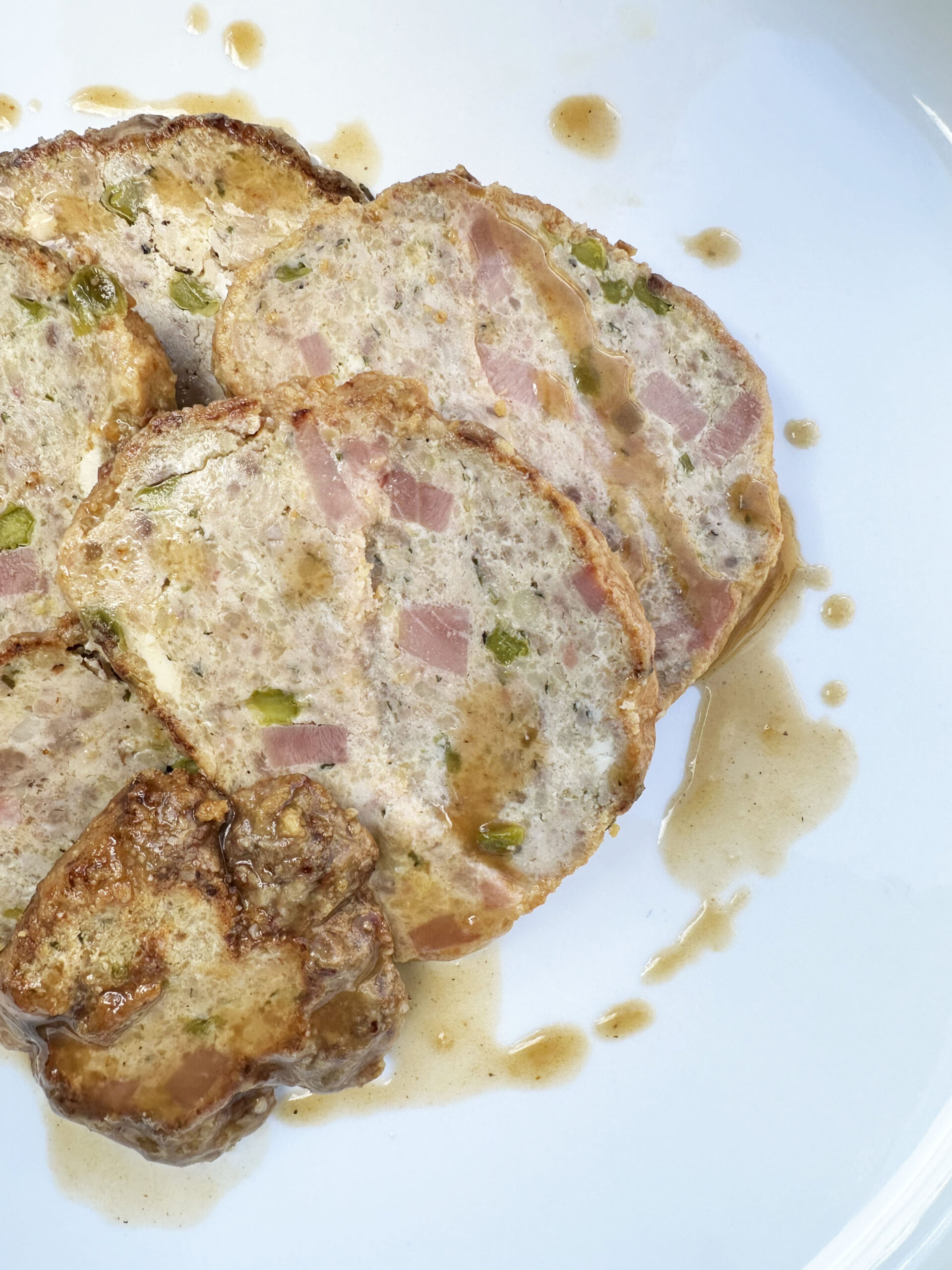INGREDIENTI: impasto a composizione variabile. ing. pane(contiene GLUTINE) salume, (carne suina,sale,destrosio,antioss.E252,E250) UOVA, latte(contiene LATTOSIO)spezie, aglio e aromi, Grana (contiene latte, sale, caglio, LISOZIMA di UOVA); burro(contiene LATTOSIO), salvia. vaschetta da 350gr